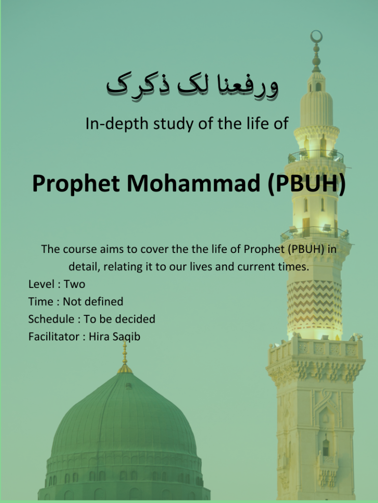 Level : Advanced Duration : 1 to 3 years Time and Day : Every Wednesday (2:00 – 3:30pm PKT & 5:30 – 7:00pm PKT) Language : Urdu Cost : Time and commitment Eligibility : Completion of short or long term Seerah course.